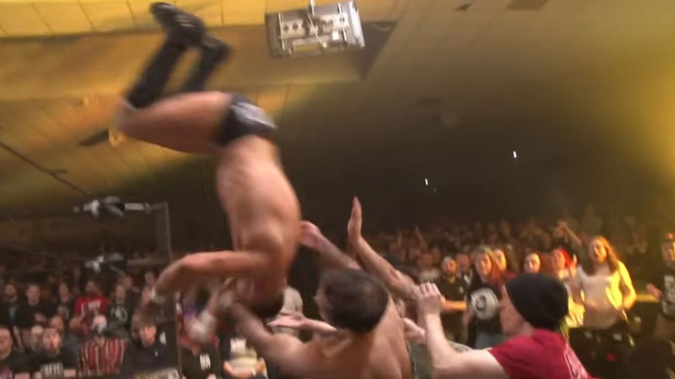 This is for Devlin’s OTT World Championship. The crowd is overwhelmingly pro-Starr and they boo Devlin loudly and chant “you sold out” as the bell rings. Starr rushes Devlin and double-legs him to the mat. Both wrestlers take turns hitting mounted punches, leading to a yay/boo exchange from the fans. Starr overpowers Devlin with chops and hammer fists and then dumps him to the floor for a dive. Starr throws Devlin back into the ring but Devlin wipes him out with a suicide dive of his own. Another yay/boo punch exchange ensues until Devlin goes for a ringside powerbomb. Starr escapes and throws Devlin into some ringside seats. He charges for a big running attack but Devlin sidesteps, sending Starr into the same chairs.