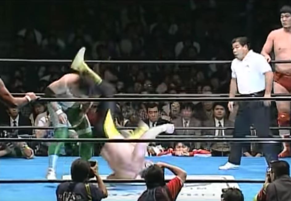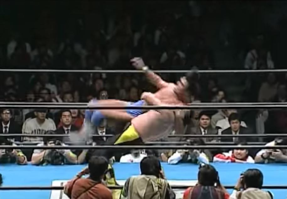 Akiyama counters a rear waistlock into an armlock of sorts then kicks Kawada in the back. Misawa tags in and lands his diving spinning lariat. He follows with a spinning back suplex and a standing senton for a two-count at the five-minute mark.