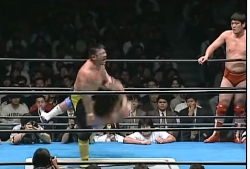 Kawada tags in Taue who lands another guillotine drop and applies a chinlock. Misawa tries to fire back with elbows but Taue Chokeslams him down hard and fast. Then he rubs his boot on Misawa’s chin, putting more pressure on it and his neck. Taue lands a piledriver causing Misawa to roll to the ropes at the ten-minute mark. He goes for the apron Chokeslam but Akiyama saves Misawa. But then Kawada comes in to get rid of Akiyama and yakuza kicks Misawa. Taue’s getting ready for the Chokeslam but Misawa still fights back. They boot each other and Taue goes down. Somersault senton by Misawa.