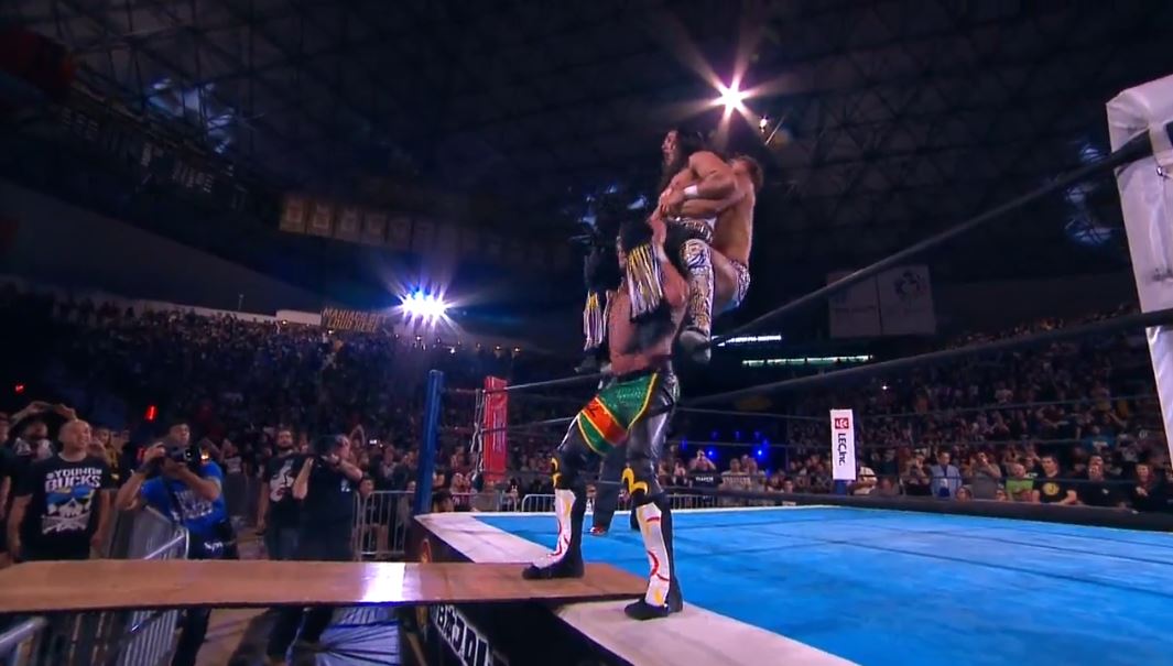 Nick sets up a table and places Omega onto it. Matt has to choose between diving onto Ibushi or onto Omega. The two brothers argue and Matt shifts back and forth. But that delay allows Ibushi to bicycle kick Matt. But then, Nick clotheslines Ibushi out of the ring. Meanwhile, Omega gets up, sees the table, and gets a great idea. He hoists Matt up for the One-Winged Angel. Matt tries to fight out of the OWA into the table, but here comes Ibushi. He springboards onto the top rope and grabs Matt. And then German suplexes Matt off Omega’s shoulders into the ring for a close two-count. Damn, that was crazy.