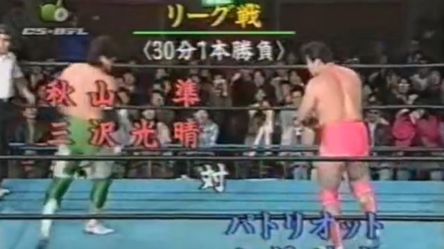 Kobashi and Akiyama have another chop/elbow exchange until Kobashi applies a facelock/abdominal stretch combo hold that’s quickly broken up by Misawa. Kobashi slams Akiyama and hits a Hogan leg drop for another two-count. Patriot tags in and hits a proto-Rainmaker followed by a DDT for yet another close two-count. Patriot goes for a powerbomb but tackles Misawa when he enters the ring. Akiyama tries capitalizing with a lariat but Patriot ducks. Patriot goes for a full nelson but Akiyama ducks down, kicks Patriot off, and lands an overhead throw. Finally Misawa tags in. he lands a diving spinning lariat for a two0count and sends Patriot into a corner. Patriot boots him on a carge and goes for a lariat. Misawa blocks and tries a Tiger Driver. Patriot powers out and goes for a boot. Misawa blocks and hits a back elbow. Misawa charges but runs into a swinging powerslam that gets a two-count. Kobashi tags in and we get yet another chop/elbow exchange. Misawa ducks a rolling chop and hits more elbows. Kobashi ducks a spinkick, lands one of his own to Misawa’s gut, and drops him with two DDTs for, you guessed it, a two-count. Kobashi chops Misawa in one corner and sends him into another but Misawa blocks with his foot. Kobashi expects this and kicks Misawa’s collar. Misawa hits a back elbow to block a charge and goes for a springboard back elbow. But Kobashi catches him and lands a half-nelson suplex. Patriot knocks Akiyama down as Kobashi covers Misawa. One, two, Misawa kicks out.
