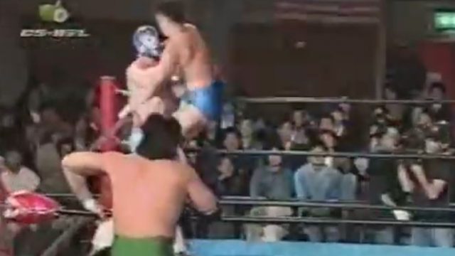 Benoit tags in and trade stiff shots with Sasuke. They struggle for control until Eddy breaks up a double wrist-lock. Sasuke fights into a Boston crab but he’s too close to Otani and Otani tags in and drops Sasuke with spinkicks. Otani locks in his own single leg crab and lets go as Eddy approaches. But when he turns around Sasuke hit his own kick and slams Otani so that the now-legal Eddy can hit a frog splash for a two-count. Eddy gets another two-count off a bridging fallaway slam and off a super hurricanrana. Eddy locks in the Gory special submission hold and Sasuke hits an ax handle to Otani while Eddy flips Benoit off. Sasuke and Otani trade leglocks but Otani gets the upper hand since he’s a superior mat wrestler. But he gets too close to the ropes and once again Eddy gets involved. Otani pulls Sasuke to his corner and tags Benoit, who hits a top-rope superplex and covers but Eddy breaks it up yet again. Benoit lands a bridging dragon suplex but Sasuke kicks out. Sasuke reverses an Irish whip and Benoit ducks one kick but can’t avoid his next two. Benoit falls to ringside and Sasuke charges or a dive. Benoit gets out of the way so Sasuke jumps onto the top turnbuckle and dives over the ringpost onto Benoit on the floor. Nice.
