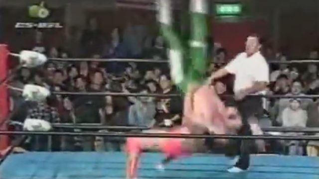 The match: Things start off with both guys avoiding running attacks from each other. Hansen gets a clean break on the ropes and then gets an armlock but Nord gets a ropebreak of his own and hits a chop. Hansen starts pummeling Nord with stiff shots and then does an elbow drop into a chinlock. Nord counters into an armlock but Hansen gets a ropebreak. He goes after Hansen’s lariat arm a second time and kicks it while it’s wrapped around the top rope. Nord grabs a chair and smashes Hansen’s arm with it (DQs are extremely rare in All Japan AFAIK) but Hansen hits back with kicks and a back elbow using his right arm. Nord goes for an armbar on the bad arm but Hansen escapes with head-butts. Hansen tries pulling Nord back up but Nord hotshot Hansen’s bad left arm over the top rope. Nord even resorts to head-butting Hansen’s arm but Hansen still has fight in him. he brawls using his right arm, his legs, and his head; in short, anything but his left arm.