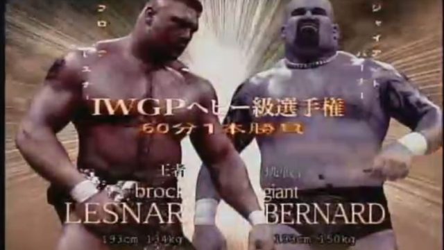 Background: Lesnar left WWE in 2004 and joined New Japan in late 2005. His first match for the company was in October and in that match he won the vacant heavyweight title. And after successfully defending it against Shinsuke Nakamura and Akebono, Lesnar would have his first and only match against fellow WWE alumnus Giant Bernard, better known as (Prince)Albert/Balbo/(Lord)Tensai/A-Train. This was also the first foreigner vs. foreigner heavyweight title match in New Japan since Vader vs. Hansen in 1990.