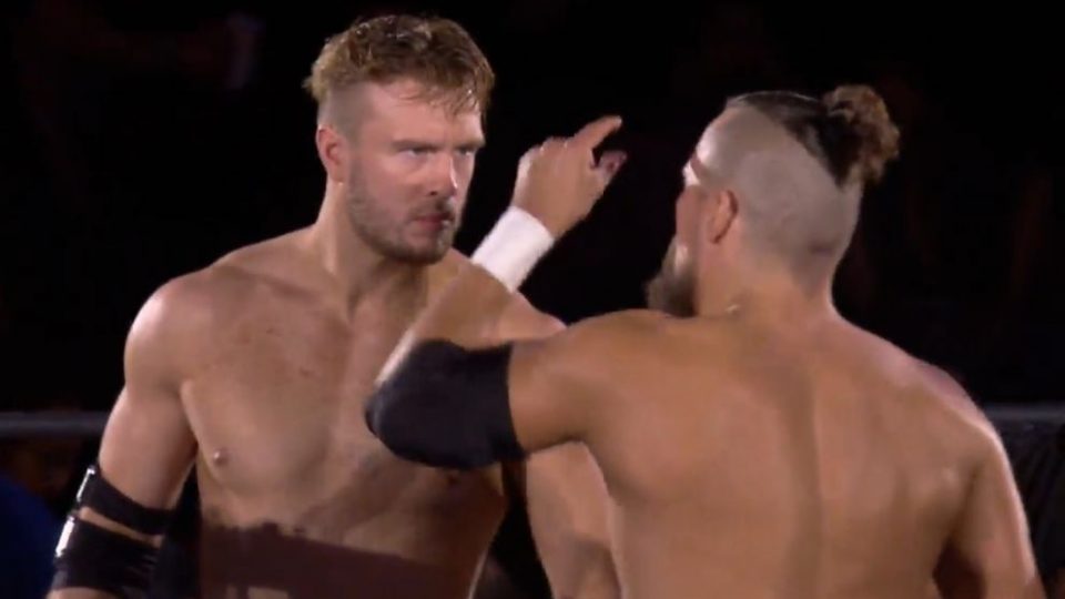 Ospreay tosses Scurll into the ring and lands a Robinson Special (corkscrew kick to the head). He goes for the Os-cutter. Scurll counters with a backslide into a superkick. Both men go down and then struggle back to their feet. Scurll tries a double underhook slam but Ospreay powers out and goes for his Stormbreaker finisher. Scurll escapes that and hits back with a chop. Ospreay fires back with a running boot and a rebound lariat.