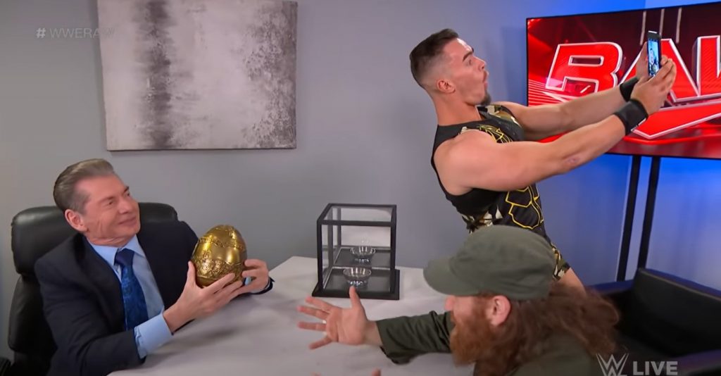 The missing egg story comes to an end (Thank God) and the culprit was revealed as Austin Theory. Theory said he took it to get a selfie with it. Instead of firing him, McMahon rewards Theory with the WWE Championship match as this whole angle lays an egg.