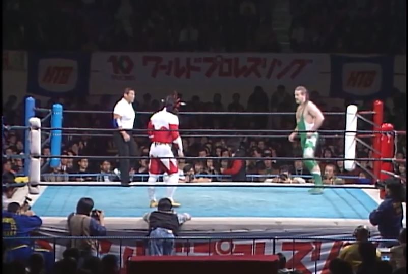 The match: They shake hands and the match begins. They trade clean breaks and then do the Greco-Roman knuckle lock. Mutoh overpowers Flair but Flair gets to the ropes for safety. After a brief pause, Flair takes Mutoh to the mat and starts working his arm. Flair’s armwork goes on for a while until Mutoh gets a ropebreak of his own. Mutoh goes to ringside to recover, but when he returns Flair goes right back to that now-weakened left arm. Mutoh counters into a headlock takeover but Flair does his classic roll-into-a-pin counter, only for Mutoh to hit the ropes. They lock-up again and Mutoh tackles Flair to the mat. He follows with two dropkicks, the second sending Flair to the floor. Mutoh goes to the top rope for a dive but Flair rolls to the ringside photographers to create more distance which prevents Mutoh from diving.