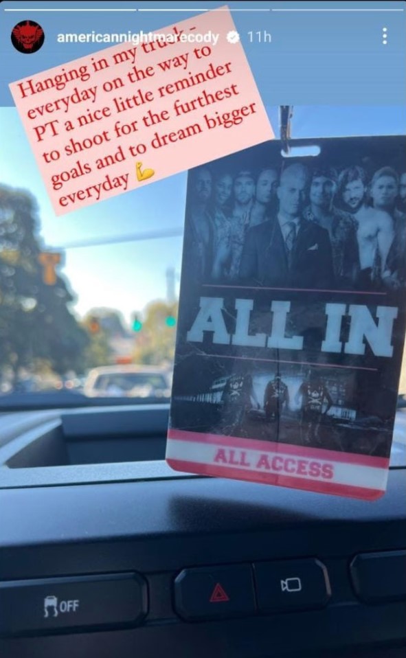 Recently, Cody shared an image on his Instagram story where he revealed that he keeps his All In access pass in his truck.