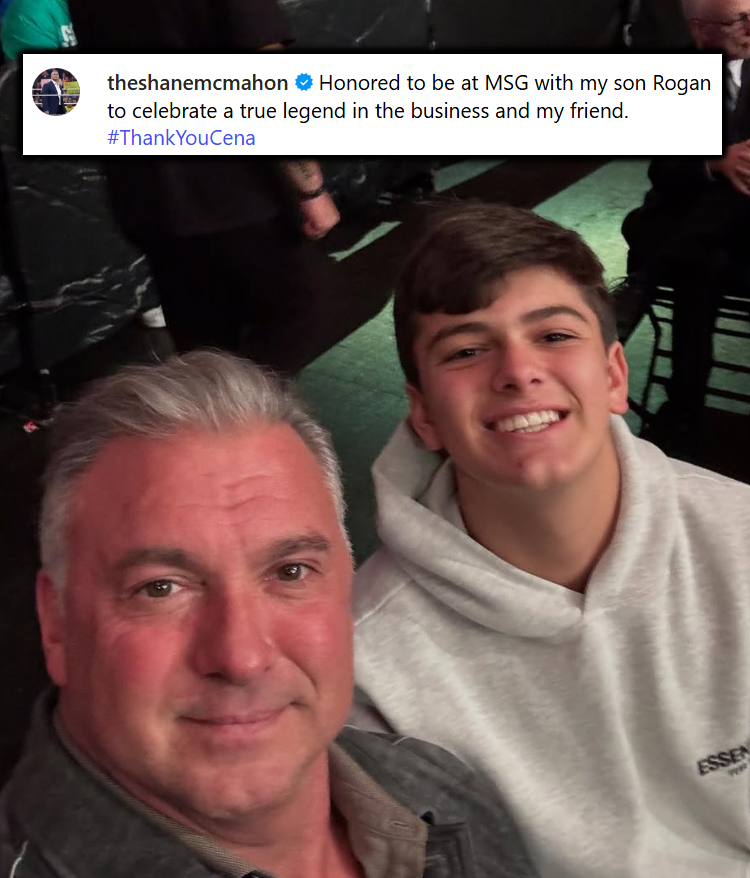 Despite not being a part of the current WWE, Shane McMahon was there this past Monday, November 17th, for John Cena’s final episode of Raw as an active WWE superstar. Shane was there with one of his three sons, Rogan.