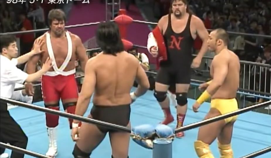 Ace lands a diving clothesline and a corner clothesline on Hansen, but Hansen elbows him on a follow-up clothesline. He tries to suplex Hansen but Hansen counters and starts mauling Ace in the corner. Hansen locks in a deep sleeper and Ace tries to fight through it, but Vader kicks him to weaken his resolve. Ace fights through and takes Hansen down by his arm but Hansen gets a ropebreak. Ace tackles Hansen to the floor and then lands some body strikes before tagging Kobashi. Hansen resists an Irish whip and then no-sells Kobashi’s chops. He head-butts Kobashi into a corner and keeps him down with more stiff shots before tagging Vader. Vader lands a belly-to-belly but Kobashi starts firing up again with chops. He tries to suplex Vader and actually gets Vader an inch off the ground but Vader counters it and suplexes Kobashi. Vader throws Kobashi out of the ring and then drives him spine-first into the steel ringpost. He goes for a short-range lariat but Kobashi ducks and DDTs Vader onto the ringside mats. Hansen attacks Kobashi from behind but Ace takes Hansen out and then holds Vader in place. Kobashi takes advantage and hits a tope-rope crossbody to the floor and then throws Vader into the ring, where he hits a massive discus chop to the neck. He pins Vader but only gets two.