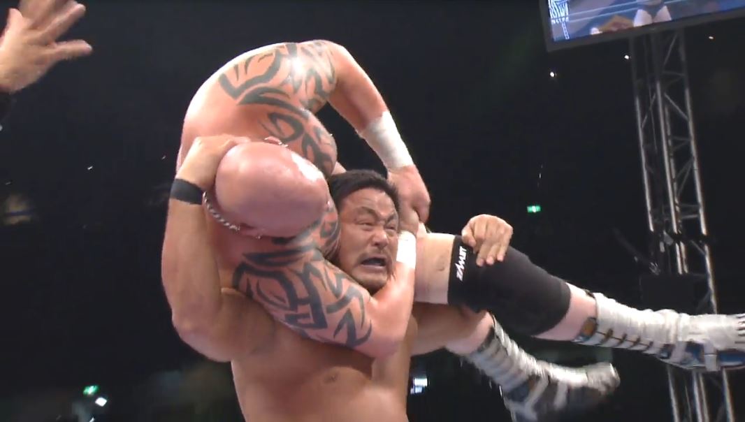 Ishii escapes a waistlock and charges but gets dropkicked on his knee. Minoru kicks at that leg but Ishii counters into a backdrop suplex for two, followed by a bucklebomb. He whips Minoru into another corner and Takaiwa clotheslines Minoru. Takaiwa then lands a two deadlift powerbombs and on the third lift transitions Minoru to Ishii who lands a big suplex. Ishii pins but TM4 saves his partner. Ishii and Takaiwa go for some corner double move but TM4 cuts them off. Takaiwa clotheslines TM4 out of the ring and charges with a lariat, but hits Ishii by accident. Minoru counters a clothesline into a release dragon suplex and then roundhouse kicks both opponents. Missile dropkick/German suplex combo by TM4 and Minoru. TM4 dives through the ropes to keep Takaiwa at bay. Minoru lands a backdrop and a kick to Ishii’s head for the pin and the win after twelve minutes.