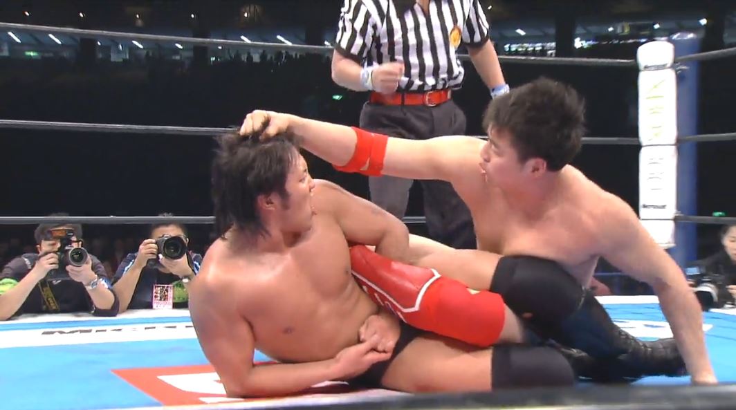 The bell rings and Shibata lands an explosive flurry of martial arts strikes. He pushes the ref down as he punts Tanahashi in the back, sending Tanahashi out of the ring. Tanahashi rushes back in and eats more hard kicks but fires back with a dragon screw leg whip. Shibata no-sells it so Tanahashi dropkicks him, which Shibata also no-sells. They meet in the centre of the ring and Shibata dares Tanahashi to hit him, which Tanahashi does. Shibata wins the strike exchange (because, duh) and starts stomping on Tanahashi’s head like a jerk. Tanahashi tries to fire back with forearms in the corner, but Shibata no-sells and they pull each other by the hair.