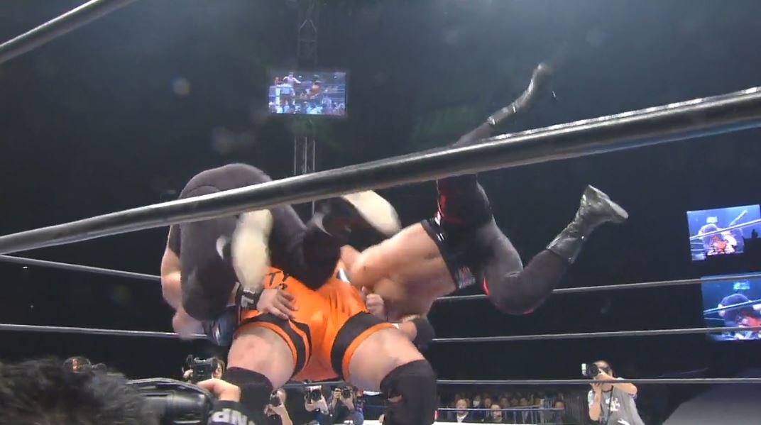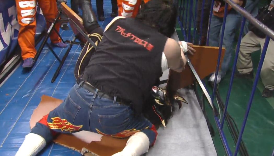 Jado locks in a crossface that goes on for a bit until Tanaka breaks it up. Jado goes for another German on Hido, but Hido counters into a roll-up for two, and then Jado counters that into his own roll-up, also for two. Tanaka lands a big clothesline as one of the outsiders’ friends in orange jumpsuits distracts the referee. Hido grabs a wooden board and cracks it over Jado’s head and pins but Jado kicks out at one. Jado knocks two of them down with clotheslines but Tanaka cuts him off. Tanaka lands his Diamond Dust (diving Stunner) finisher and Hido lands a diving splash, giving his team the win after ten minutes.