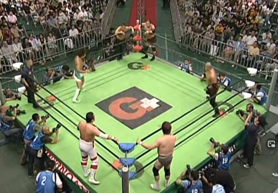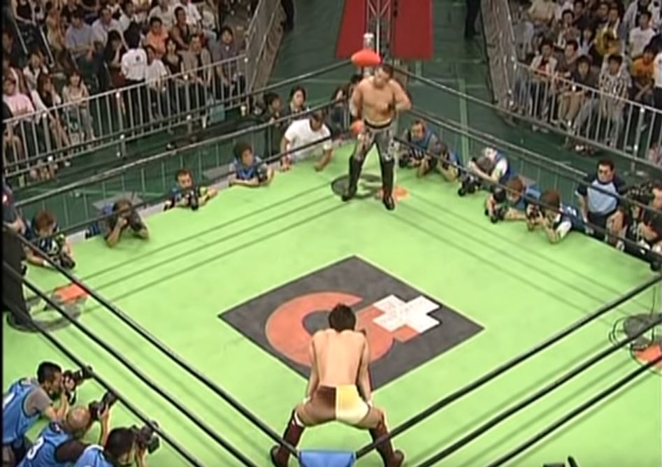 Going into this match, Rikio was defending his title against New Japan’s Hiroshi Tanahashi. This was before Tanahashi became New Japan’s biggest savior and arguably the best pro wrestler of the 21st century. Here, he was hoping to steal NOAH’s world title from under them and add a second belt to his collection (he was IWGP U-30 Champion as well. That was an experimental title meant to be fought over by wrestlers under the age of 30, but that experiment never really took off).