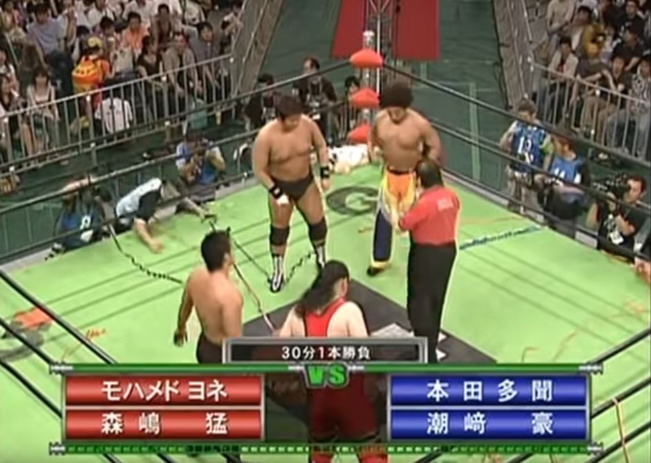 Background: Burning is the stable Kenta Kobashi formed in late 1998 and brought into NOAH. He was preoccupied on this show (we’ll get to him later) so two of his stablemates had this match to try and achieve some glory for the group. Honda was an Olympic-level wrestler (basically a lesser version of Kurt Angle) that was a midcarder for life until he challenged Kobashi in 2003 for Kobashi’s newly-won GHC Heavyweight Championship. Honda lost, but he put on such a valiant effort that Kobashi demanded he become his new main tag partner. The second guy, Shiozaki, was a rookie with less than a year’s worth of experience going into this match. Their opponents were Yone (an undercarder still looking to prove himself) and Morishima (a massive brawler that looked like a Japanese Terry Gordy and hit like a Japanese Stan Hansen).