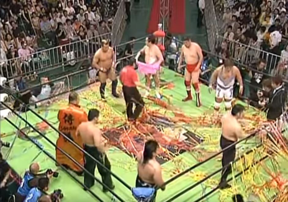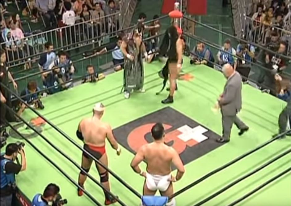 Background: This is a match that mostly featured old-timers in the twilights of their careers and lower-card guys. The most notable ones are Taue (a 1990s legend who gets a huge reaction), Koshinaka (who trained and debuted in All Japan but became famous in New Japan), Saito (who had the worst case of ‘wrong place wrong time’ in wrestling history since he wrestled in Misawa’s last-ever match) and Eigen (who was later discovered to have ties to the Yakuza).
