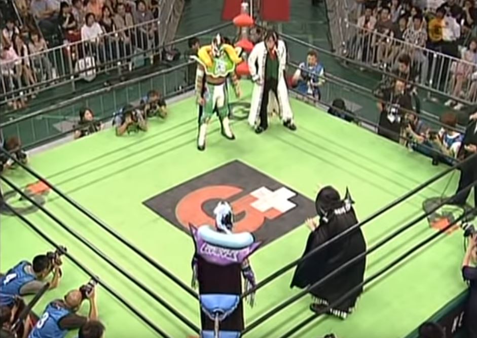 This is followed by some dude in a black cloak playing an over-the-top villain cuts a very cheesy promo before introducing and accompanying to the ring Mushiking Joker. Joker is Ricky Marvin, a luchadore from the CMLL promotion in Mexico that looks to have found steady work in Japan.