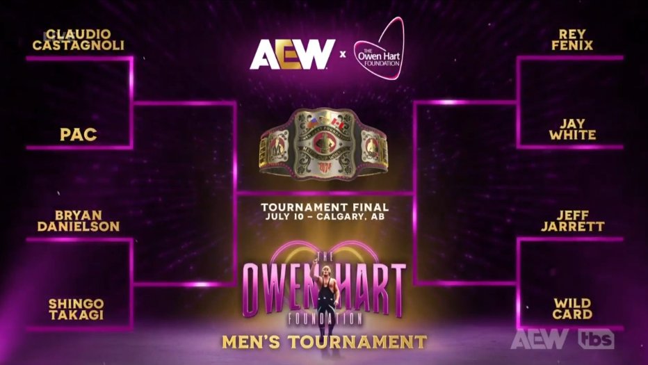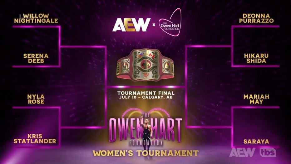 The Men’s and Women’s Owen Hart Foundation Tournament brackets were shown on screen. The winners of the tournaments get World Title matches at the All In PPV.