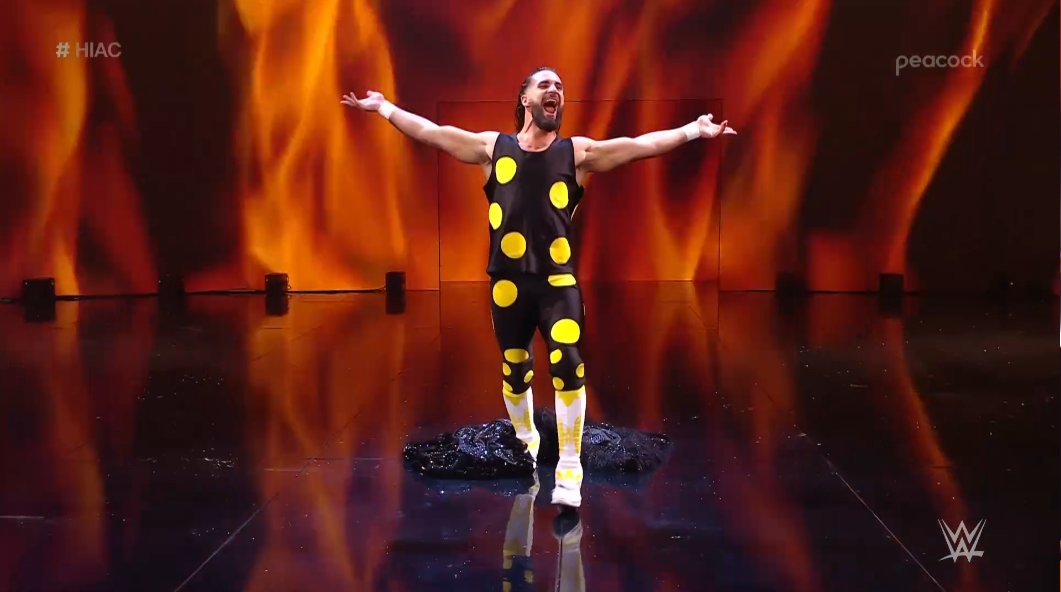 The red Hell in a Cell structure surrounded the ring. Seth “Freakin” Rollins made his entrance first. Seth was wearing black gear with yellow polka dots that Cody’s dad Dusty Rhodes used to wear in his WWE career. It’s a unique look, that’s for sure.