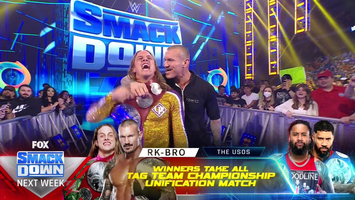 A graphic was shown to make it official. Next week on Smackdown in Grand Rapids, Michigan: RK-Bro vs. The Usos in a Winners Take All Tag Team Championship Unification Match.