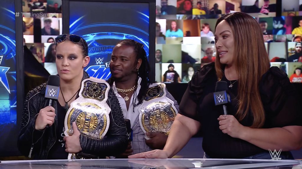 The next guests are the Women’s Tag Team Champions Shayna Baszler and Nia Jax (with Reginald). Kayla mentions the shopping segment which Nia and Reginald enjoyed but not Baszler. Kayla questions Nia about what does she like about Reginald. However, Jax avoids answering the question, saying she and Reginald are in a “situationship”. Kayla then brings up Jax getting a championship match against Smackdown Women’s Champion Sasha Banks on next week’s Smackdown. With the possibility of walking into Wrestlemania as a double champion, Nia says Wrestlemania is two nights, so she can defend the Smackdown Women’s Champion on one night and then the Women’s Tag Team Championship on the second night. Heyman talks about Nia having to possibly defend the championship against Bianca Belair, whom he calls “one of the hottest superstars right now”. Believing she has to be focused to defend the Smackdown Women’s Championship against Bianca at Wrestlemania, Heyman bringing up a scenario where Nia can defend the championship against Bianca while Baszler defends the Tag Team Championship on her own. Nia agrees with Paul because she knows her partner can before Baszler says she would absolutely fight any two women by herself. However, Jax says she was kidding about Baszler defending the championship by herself. Baszler asked Jax how would win the Smackdown championship without her. Tension brews between them, until Nia questions Baszler about going after the Raw Women’s Championship. Baszler remains quiet, thinking about the scenario before Jax and Reginald walk after. Shayna looks to Heyman and gives him a smirk before leaving the set.