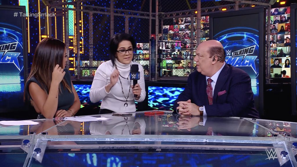 The first guest is “The Role Model” Bayley. Heyman kisses Bayley on the hand in which she pretends to faint. Bayley does the same Kayla but the host plays it off. Bayley tells Kayla she is here to take her spot, adding that says she can offer more to Talking Smack than the current host. Heyman brings up Kayla’s appearance on Raw Talk, which the host says was pleasant to have a co-host like Truth. Bayley tells Heyman she would never leave him for Raw Talk. Kayla speaks about Bayley’s “sweet tweets” segment, mentioning that the “Ding Dong Hello” host crumbled on the tweets. Bayley tells Kayla she has her host outfit so she will ask the questions. Bayley asks Kayla if she was the one who wrote that her show was an abomination. Kayla answers that she did not but would give an applaud to whoever did. Bayley breaks her glass out of frustration before Braxton asks her a question. When asked who would she like to have as a guest on Ding Dong Hello, Bayley says she has a lot of guests such Ellen, Seinfeld, and even Ricki Lake. Kayla mentions Bayley receiving a tweet from a fake Ellen account. However, Bayley says she knew because if she would receive a text from the real Ellen instead of a tweet. Heyman apologizes to Bayley for Kayla’s behavior and accuses his co-host of besmirching their guest. Bayley says she still runs Smackdown and tells Braxton to get off her show. The interview ends with Heyman thanking Bayley and adds that Kayla should step in the ring with their guest.